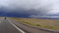 We got caught in this rainstorm big time! The sky was so black we put our wet weather gear on over our waterproof riding gear and just as well we did. Very heavy rain and and also fork lightening flashing all around us and booming thunder!! It was pretty crazy/exciting. The storm was coming towards us and there was nowhere to shelter, not even a bridge so we just had to keep going. We have the right gear so stayed warm and dry.